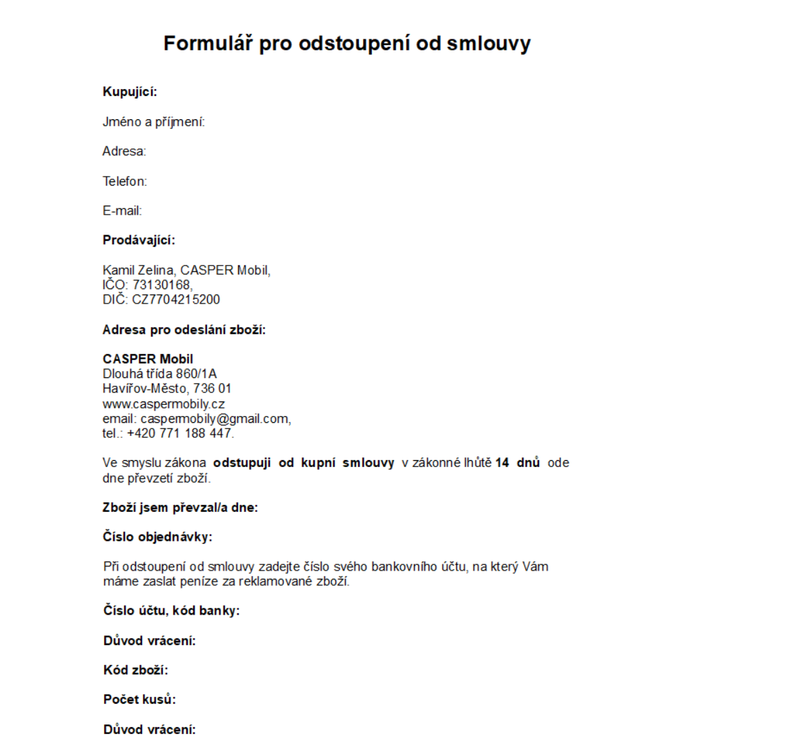 5.2. Nejedná-li se o případ uvedený v čl. 5.1 obchodních podmínek či o jiný případ, kdy nelze od kupní smlouvy odstoupit, má kupující v souladu s ustanovením § 1829 odst. 1 občanského zákoníku právo od kupní smlouvy odstoupit, a to do čtrnácti (14) dnů od převzetí zboží, přičemž v případě, že předmětem kupní smlouvy je několik druhů zboží nebo dodání několika částí, běží tato lhůta ode dne převzetí poslední dodávky zboží. Odstoupení od kupní smlouvy musí být prodávajícímu odesláno ve lhůtě uvedené v předchozí větě. Pro odstoupení od kupní smlouvy může kupující využit vzorový formulář poskytovaný prodávajícím, jenž tvoří přílohu obchodních podmínek. Odstoupení od kupní smlouvy může kupující zasílat mimo jiné na adresu provozovny prodávajícího či na adresu elektronické pošty prodávajícího Casper, Dlouhá třída 468/13a, Havířov-Město, 736 01.